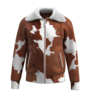 White rabbit fur trims the collar of a handsome jacket crafted from New Zealand cowhide fur.